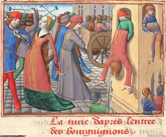 La foule se porta à la Conciergerie du Palais. On en tira par force le comte d’Armagnac, connétable de France, le chancelier Henri de Marle, l’évêque de Coutances son fils. On les massacra dans la cour du palais. Puis on les dépouilla, et on les abandonna tout nus aux outrages de la plus vile canaille.